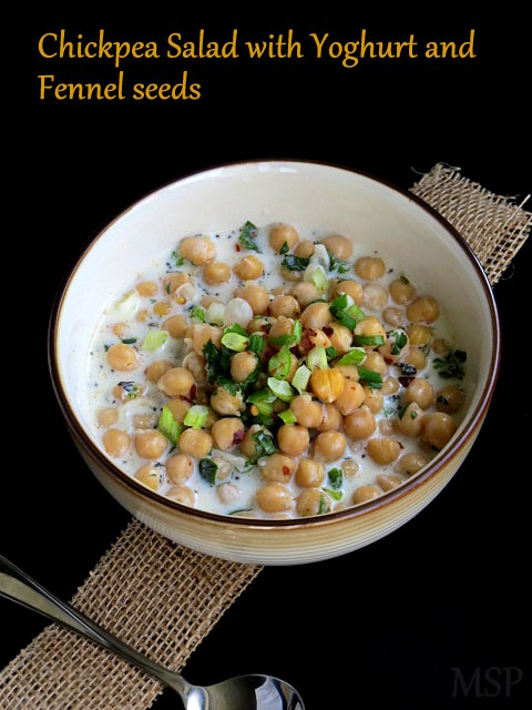 This chickpea salad in yoghurt, spiced up with fennel seeds and dressed in a yoghurt dressing is perfect for a summer lunch / Supper. Refreshing and chilled yoghurt, vivid and fragrant herbs along with slight sweetness from the fennels in between bites is very palatable and rejuvenating. This can be even had as a side for any variety rice. This can also be had as a raita by increasing the curd quantity. I used my home made curd that was not quite thick. Try using a thick yoghurt so that it coats and sticks to the chickpea. Either ways they will taste great!