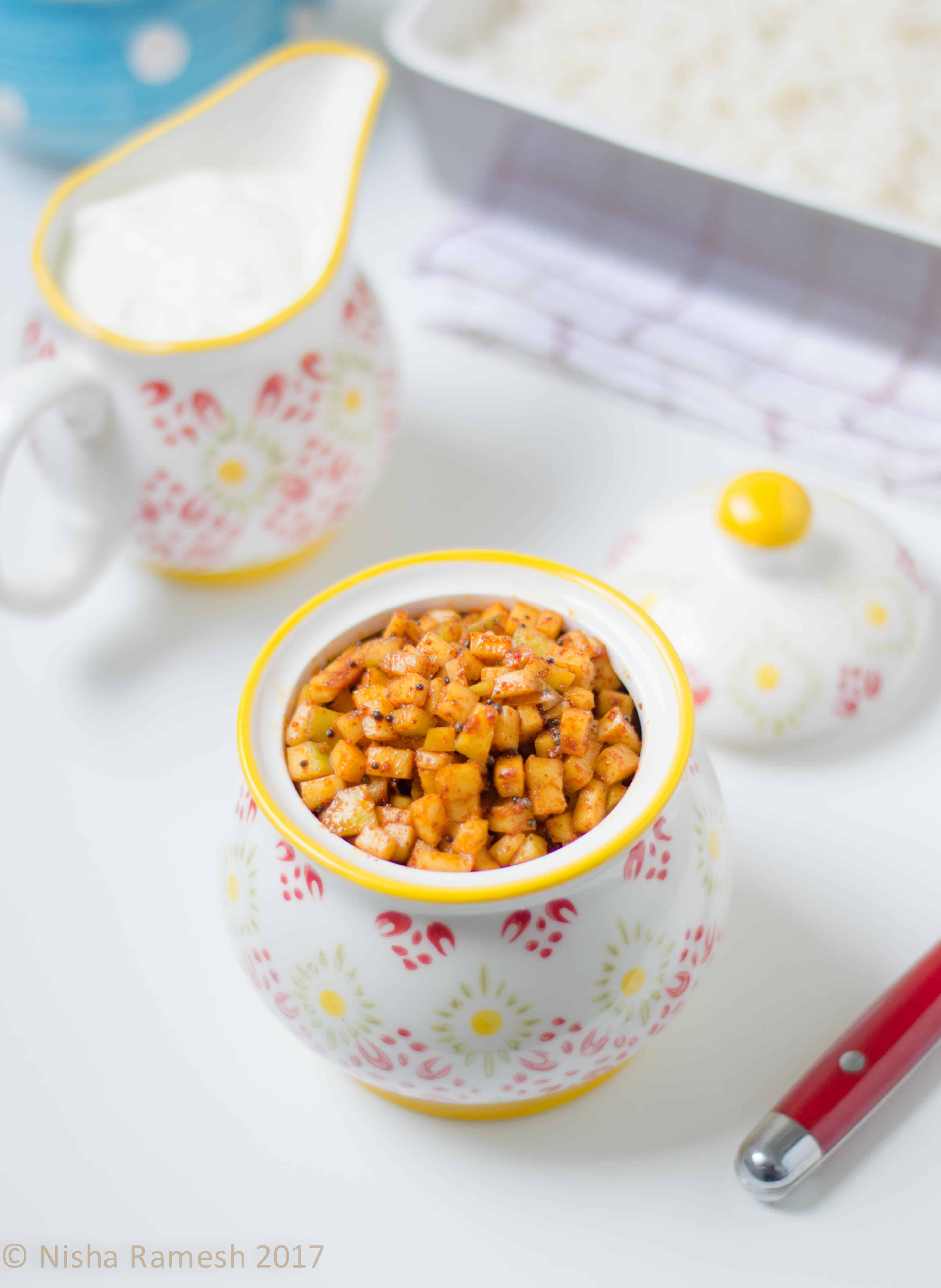 This instant pickle is quite easy to make. Chop and mix with seasonings, let it rest for overnight and enjoy. That is all it takes. Only use the raw variety and the small unripe varieties are the best. It imparts the sourness that is the key flavour in this dish. To balance this sourness, we add the spices - chilli powder for the heat & the fenugreek powder for the bitterness. This provides an excellent flavour profile. The best way to have this is with curd | Yoghurt rice.